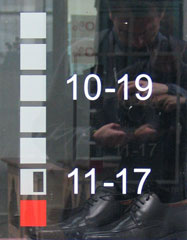In Riga (Lettland) sind an sehr vielen Geschäften diese Art von Darstellung der Öffnungszeiten im Schaufenster zu finden. Die Lösung gefällt mir sehr gut, weil sie auch aus großer Entfernung gelesen werden kann, was für solche Schilder nicht selbstverständlich ist. Das Ganze funktioniert umso besser, je übersichtlicher die Öffnungszeiten selber sind. Mittagspause oder gar der lange Donnerstag würden den Grafiker vor einige Herausforderungen stellen. Die verschiedenen Umsetzungen bedienen sich am Wochenende teilweise der Redundanz, wo ein Schlüssel, Bindestrich oder das Wort „geschlossen" das andersfarbige/ andersartige Signet ergänzt.