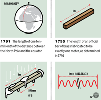 Aktuelle Definition: Der Meter ist definiert als die Strecke, die das Licht im Vakuum in einer Zeit von 1 / 299.792.458 Sekunden zurücklegt. Statt ein Meter-Eichmaß aufzubewahren, beruht die Definition des Meters damit auf einer Zeitmessung. Dies erfolgte, weil die Definition der Sekunde (Maßeinheit der Zeit) als atomares Zeitnormal gelang und somit beide Maßeinheiten unabhängig von Eichmaßen bestimmt werden können. ...