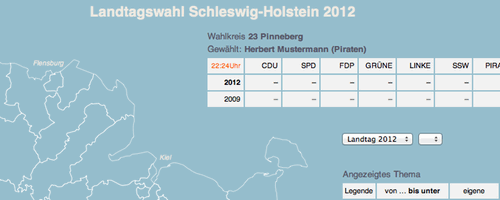 The final straw came when I thought about a layout for the 2012 election in Schleswig-Holstein (click above for a first glimpse). Clearly this map shape would waste a lot of screen real estate when put into non-overlapping boxes as is necessary for the SVG Web shim.
